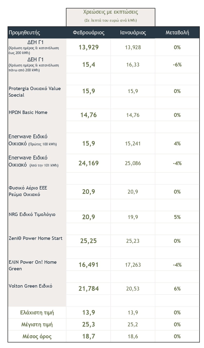 Ως αποτέλεσμα, οι χρεώσεις ξεκινούν από 13,9 και φτάνουν μέχρι τα 25,3 λεπτά ανά kWh, ενώ το εύρος τιμών τον προηγούμενο μήνα ήταν σχεδόν πανομοιότυπο (από 13,9 έως 25,2 λεπτά). Επίσης, η μέση χρέωση διαμορφώνεται στα 18,7 λεπτά ανά kWh, πρακτικά αμετάβλητη σε σχέση με τον Ιανουάριο (18,6 λεπτά).